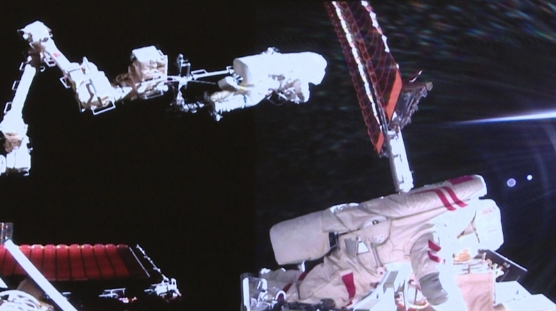 這是8月15日在北京航天飛行控制中心屏幕上拍攝的神舟二十號(hào)乘組航天員陳冬(左)與王杰在艙外工作的畫面(視頻截圖)。新華社記者 殷家捷 攝