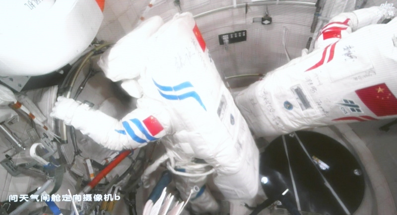 這是8月15日在北京航天飛行控制中心屏幕上拍攝的神舟二十號(hào)乘組航天員陳冬(左)與王杰準(zhǔn)備出艙的畫面。新華社記者 厲彥辰 攝