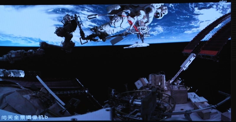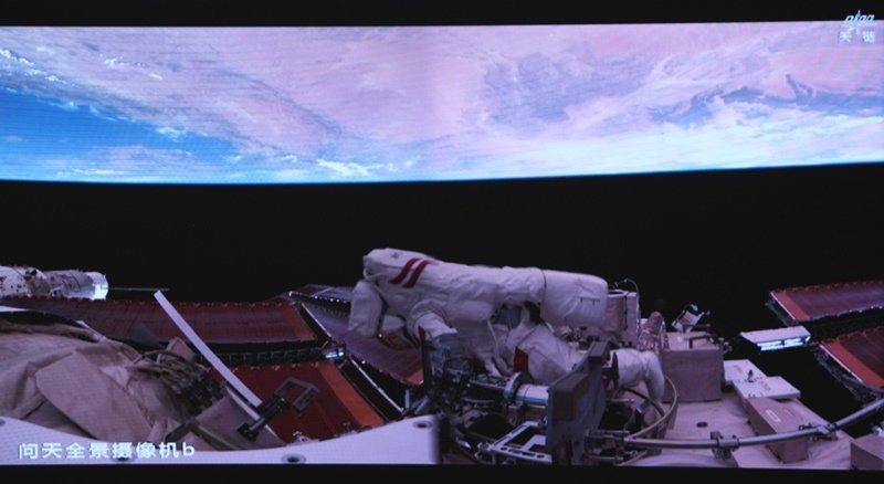 這是8月15日在北京航天飛行控制中心屏幕上拍攝的神舟二十號(hào)乘組航天員陳冬在艙外工作的畫面。新華社記者 厲彥辰 攝