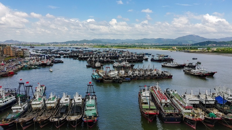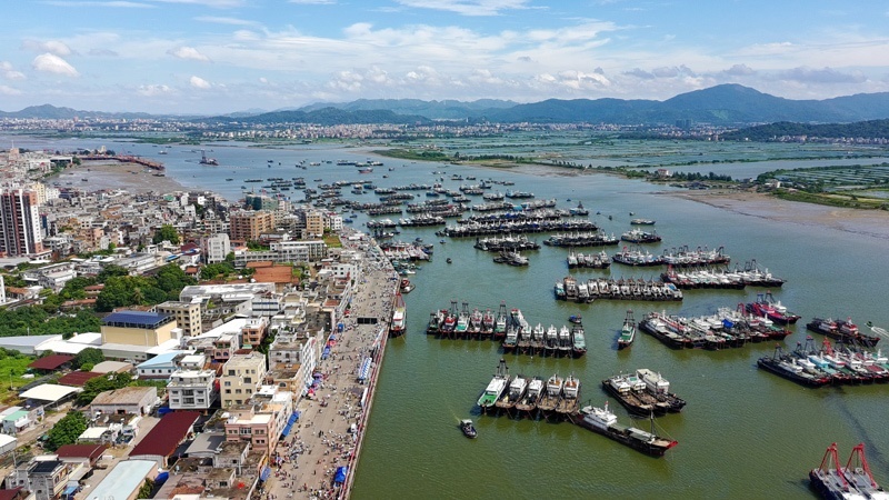 8月16日,停泊在博賀漁港的漁船等待開(kāi)漁(無(wú)人機(jī)照片)。