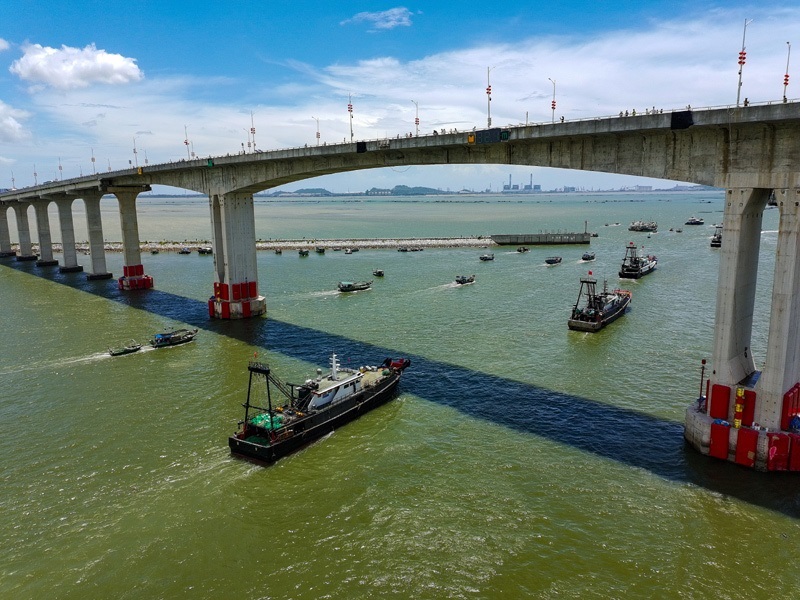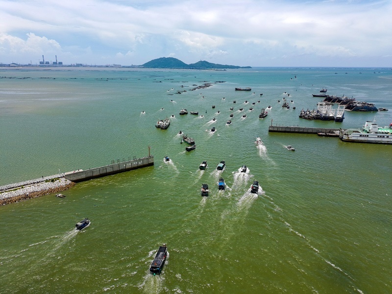 8月16日,出港的漁船駛過(guò)博賀灣大橋(無(wú)人機(jī)照片)。
