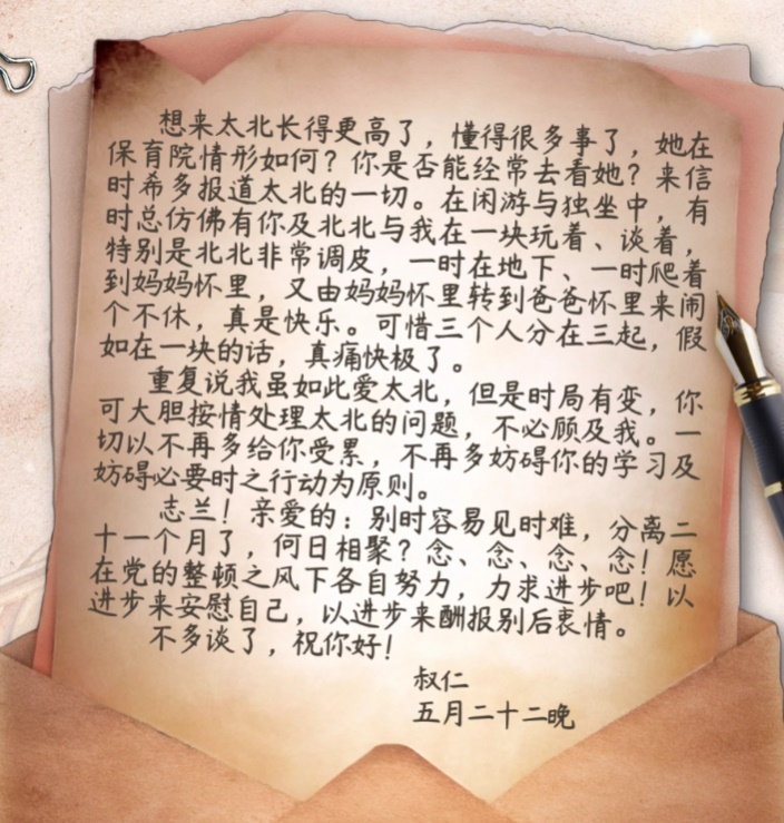 在信的最后,左權不得不忍痛交代妻子:“我雖如此愛太北,但是時局有變,你可大膽按情處理太北的問題,不必顧及我。”并勉勵妻子以進步來安慰自己,以進步來酬報別后衷情。