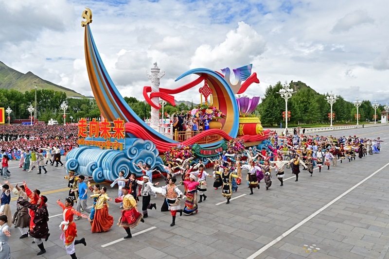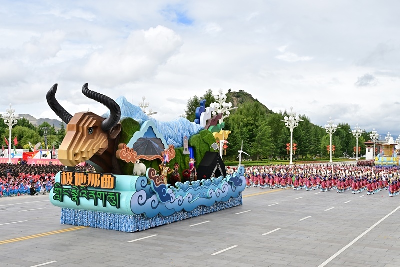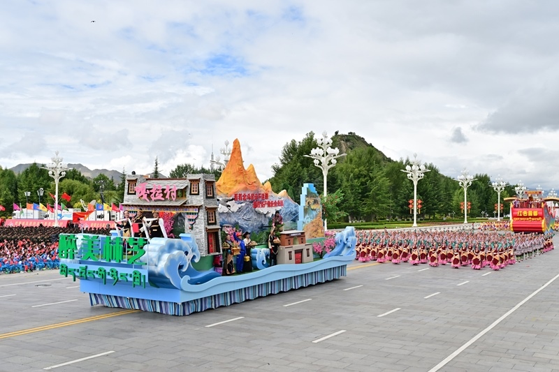 8月21日上午,西藏各族各界干部群眾約2萬人歡聚拉薩市布達(dá)拉宮廣場(chǎng),熱烈慶祝西藏自治區(qū)成立60周年。這是游行的彩車通過布達(dá)拉宮廣場(chǎng)。