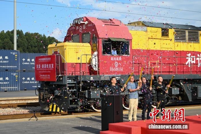 2024年10月14日,首趟滿載老撾進(jìn)口香蕉的中老鐵路“京滇 瀾湄線”國際貨運列車從云南省昆明市王家營西站駛出,標(biāo)志著中老鐵路國際冷鏈班列暨“京滇 瀾湄線”國際貨運列車正式開行。中新社記者 李嘉嫻 攝