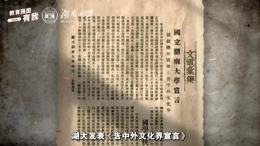 習近平總書記強調(diào),廣大青少年生逢其時,要賡續(xù)紅色血脈,樹立強國有我的遠大志向,做堂堂正正、光榮自豪的中國人,勇?lián)褡鍙团d的時代大任。2025年是中國人民抗日戰(zhàn)爭暨世界反法西斯戰(zhàn)爭勝利80周年,教育部政務新媒體推出“教育強國,有我!”網(wǎng)絡主題宣傳活動之“青年說·傳承篇”系列,挖掘高校里的紅色記憶,展現(xiàn)青年師生的時代擔當。今天,跟教育小微通過1個微視頻和1個故事,共同回顧湖南大學師生英勇抗戰(zhàn)的烽火歲月——