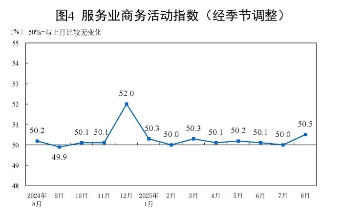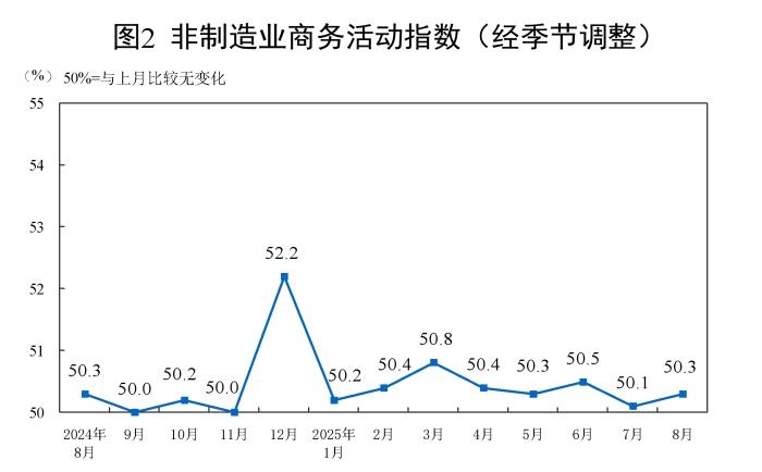 8月份,非制造業(yè)商務活動指數(shù)為50.3%,比上月上升0.2個百分點,高于臨界點,非制造業(yè)繼續(xù)保持擴張。
