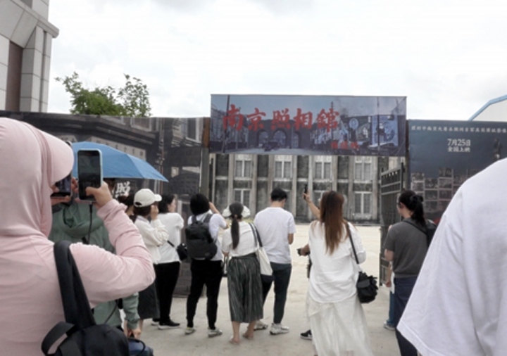7月26日,觀眾在上海影視樂園大戲院看完《南京照相館》后前往上海影視樂園實(shí)景拍攝地參觀。新華社記者 張璟怡 攝