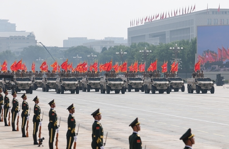 9月3日,紀(jì)念中國人民抗日戰(zhàn)爭暨世界反法西斯戰(zhàn)爭勝利80周年大會在北京隆重舉行。這是地面突擊方隊(duì)通過天安門廣場。