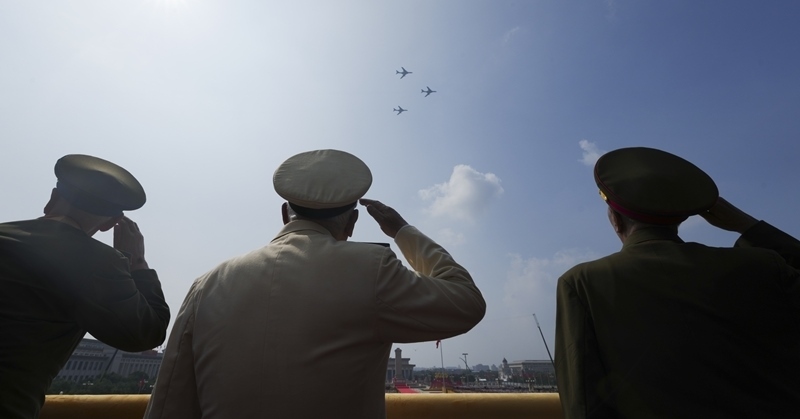 9月3日,紀(jì)念中國人民抗日戰(zhàn)爭暨世界反法西斯戰(zhàn)爭勝利80周年大會在北京隆重舉行。這是轟炸機(jī)梯隊(duì)飛過天安門廣場上空時(shí)嘉賓敬禮。