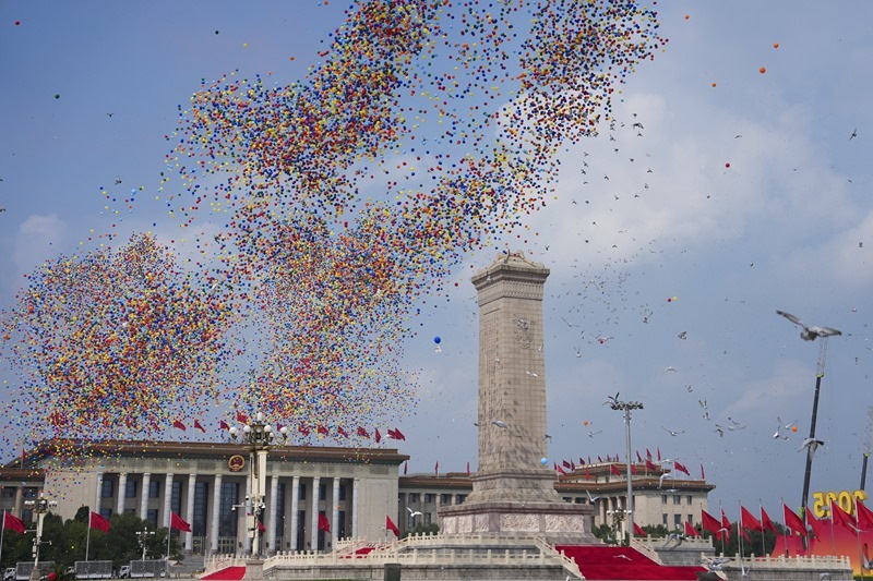 2025年9月3日,紀(jì)念中國(guó)人民抗日戰(zhàn)爭(zhēng)暨世界反法西斯戰(zhàn)爭(zhēng)勝利80周年大會(huì)在北京隆重舉行。這是紀(jì)念大會(huì)現(xiàn)場(chǎng)放飛氣球和鴿子。新華社記者 牟宇 攝