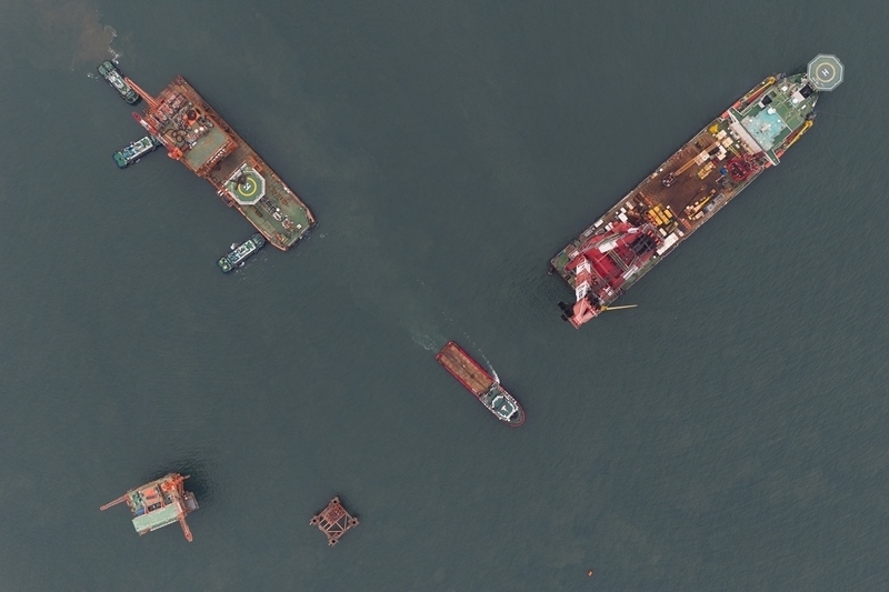 這是9月8日在渤海海域拍攝的墾利6-1油田10-1北區(qū)塊Ⅱ期開發(fā)項(xiàng)目油氣平臺(tái)安裝作業(yè)現(xiàn)場(chǎng)(無人機(jī)照片)。