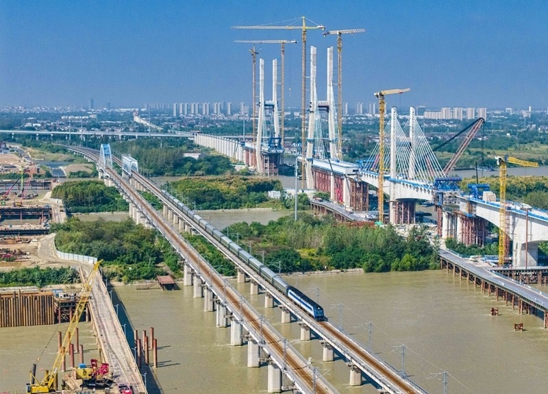 10月10日,動車組列車駛出位于江蘇省南通市崇川區(qū)的南通動車所(無人機照片)。