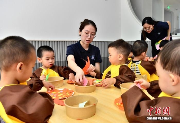 7月29日,福州新星托育園東街園老師指導(dǎo)小朋友進(jìn)行藝術(shù)創(chuàng)想,制作美味的“披薩”。近年來,當(dāng)?shù)胤e極推動(dòng)公辦幼兒園和社會(huì)力量興辦發(fā)展托育教育服務(wù),以解決民眾“帶娃難”的問題?!≈行律缬浾?張斌 攝
