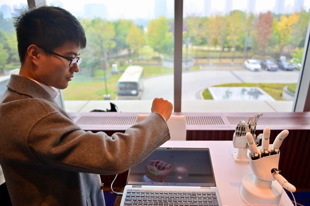 10月17日,在中國科學院沈陽自動化研究所展臺,工作人員演示“仿生五指靈巧手”展品。新華社記者 吳青昊 攝