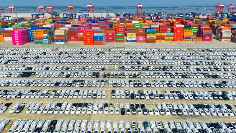 2025年10月4日在江蘇省港口集團(tuán)南京港龍?zhí)陡蹍^(qū)拍攝的準(zhǔn)備裝船出口的汽車(無(wú)人機(jī)照片)。新華社發(fā)(楊素平?攝)