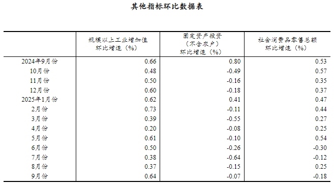 (2)根據(jù)季節(jié)調(diào)整模型自動修正結(jié)果,對近一年來各期國內(nèi)生產(chǎn)總值、規(guī)模以上工業(yè)增加值、固定資產(chǎn)投資(不含農(nóng)戶)、社會消費品零售總額環(huán)比增速進行修訂。修訂結(jié)果及2025年三季度GDP環(huán)比數(shù)據(jù)、2025年9月份其他指標(biāo)環(huán)比數(shù)據(jù)如下: