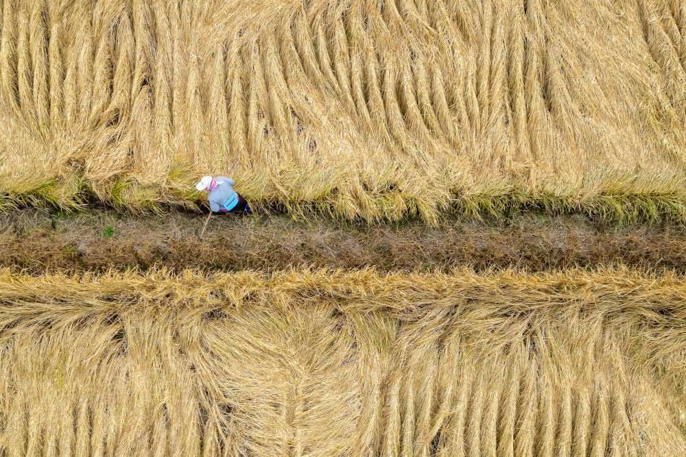10月14日,在黑龍江省牡丹江市西安區(qū)沙虎村,村民在水稻田里忙碌(無人機(jī)照片)。新華社記者 張濤 攝