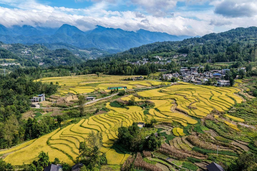 9月18日拍攝的重慶市黔江區(qū)五里鎮(zhèn)梯田景色(無人機(jī)照片)。地處武陵山區(qū)腹地的重慶市黔江區(qū)五里鎮(zhèn)水稻種植面積5300畝,是武陵山地區(qū)糧食主要產(chǎn)區(qū)之一。新華社記者 唐奕 攝