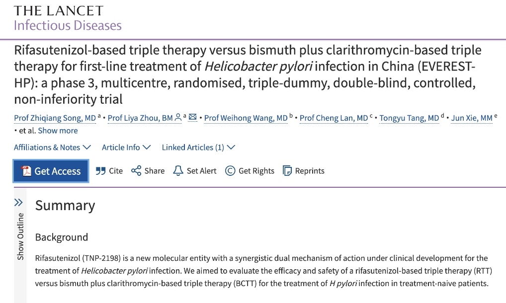 北京大學(xué)第三醫(yī)院消化科周麗雅、宋志強(qiáng)教授團(tuán)隊(duì)帶領(lǐng)全國40家醫(yī)療機(jī)構(gòu)消化疾病診療中心,通過全球首個Ⅲ期臨床試驗(yàn),證實(shí)了含利福特尼唑的三聯(lián)方案,比臨床上常用的鉍劑四聯(lián)方案具有更高的根除成功率和更低的不良反應(yīng)發(fā)生率,而且用藥更少,服用更方便,將為全球幽門螺桿菌感染者帶來了全新的治療選擇。相關(guān)成果日前于《柳葉刀-感染病學(xué)》在線發(fā)表。