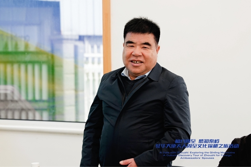 陜西省西安市周至縣樓觀鎮(zhèn)周一村黨支部書記齊平向駐華大使夫人介紹周至獼猴桃的特點(diǎn)及產(chǎn)業(yè)情況