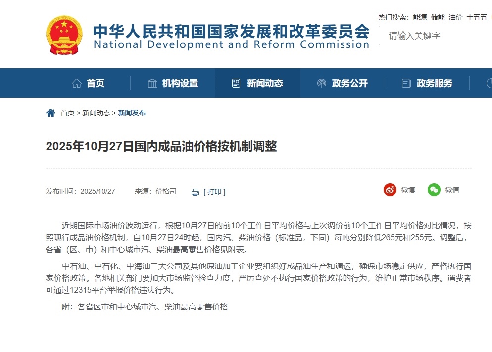 中國網(wǎng)10月27日訊 據(jù)國家發(fā)改委網(wǎng)站消息,近期國際市場油價(jià)波動(dòng)運(yùn)行,根據(jù)10月27日的前10個(gè)工作日平均價(jià)格與上次調(diào)價(jià)前10個(gè)工作日平均價(jià)格對(duì)比情況,按照現(xiàn)行成品油價(jià)格機(jī)制,自10月27日24時(shí)起,國內(nèi)汽、柴油價(jià)格(標(biāo)準(zhǔn)品,下同)每噸分別降低265元和255元。調(diào)整后,各?。▍^(qū)、市)和中心城市汽、柴油最高零售價(jià)格見附表。