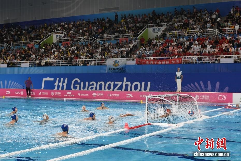 10月27日晚,在廣東廣州舉行的第十五屆全國(guó)運(yùn)動(dòng)會(huì)水球男子組比賽金牌賽中,廣東隊(duì)(藍(lán)帽)以16比9戰(zhàn)勝上海隊(duì)(白帽),獲得金牌。圖為廣東隊(duì)進(jìn)球得分。