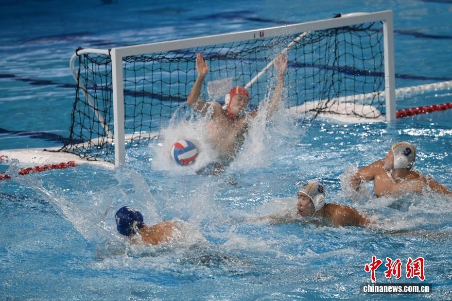 10月27日晚,在廣東廣州舉行的第十五屆全國(guó)運(yùn)動(dòng)會(huì)水球男子組比賽金牌賽中,廣東隊(duì)以16比9戰(zhàn)勝上海隊(duì),獲得金牌。圖為廣東隊(duì)運(yùn)動(dòng)員解澤楷(藍(lán)帽)在比賽中進(jìn)攻。