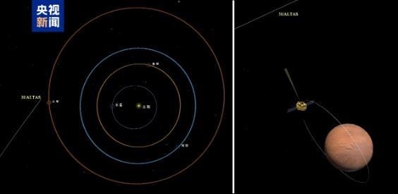 △星際天體阿特拉斯與天問一號火星環(huán)繞器相對位置示意圖(右圖是2025年10月3日相機(jī)拍攝時(shí)左圖的局部放大)