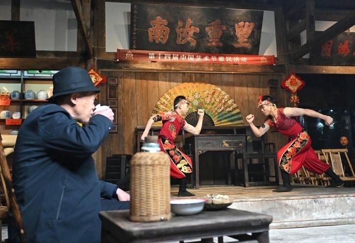 2025年10月25日,茶客在成都金琴老茶館一邊喝茶一邊觀看沈陽雜技演藝集團(tuán)雜技演員表演的雜技節(jié)目《男子對(duì)手》,這是第十四屆中國藝術(shù)節(jié)惠民活動(dòng)之一。新華社記者 劉坤 攝