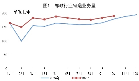 10月份,郵政行業(yè)寄遞業(yè)務(wù)量完成189.9億件,同比增長6.5%。其中,快遞業(yè)務(wù)量完成176.0億件,同比增長7.9%。
