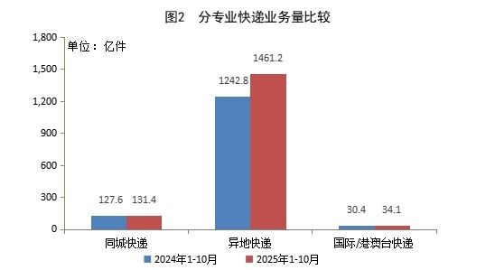 1—10月,同城快遞業(yè)務(wù)量累計完成131.4億件,同比增長3.0%;異地快遞業(yè)務(wù)量累計完成1461.2億件,同比增長17.6%;國際/港澳臺快遞業(yè)務(wù)量累計完成34.1億件,同比增長12.2%。