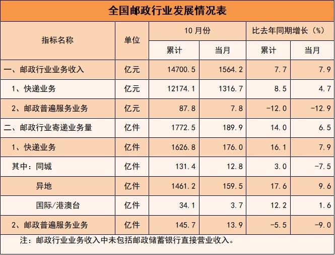 1—10月,郵政行業(yè)業(yè)務(wù)收入累計完成14700.5億元,同比增長7.7%。其中,快遞業(yè)務(wù)收入累計完成12174.1億元,同比增長8.5%。