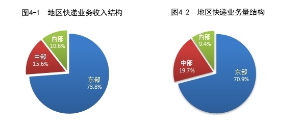 1—10月,東、中、西部地區(qū)快遞業(yè)務(wù)收入比重分別為73.8%、15.6%和10.6%,快遞業(yè)務(wù)量比重分別為70.9%、19.7%和9.4%。與去年同期相比,東部地區(qū)快遞業(yè)務(wù)收入比重下降0.9個百分點,快遞業(yè)務(wù)量比重下降1.7個百分點;中部地區(qū)快遞業(yè)務(wù)收入比重上升0.6個百分點,快遞業(yè)務(wù)量比重上升1.1個百分點;西部地區(qū)快遞業(yè)務(wù)收入比重上升0.3個百分點,快遞業(yè)務(wù)量比重上升0.6個百分點。