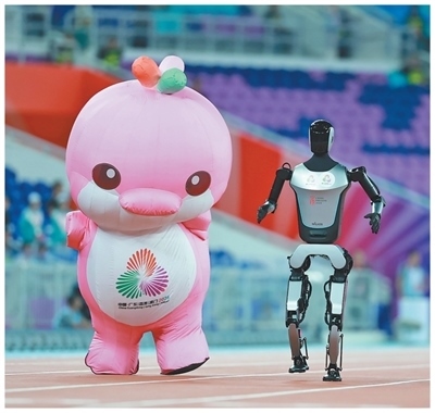 十五運(yùn)會賽場,吉祥物與機(jī)器人互動。本報(bào)記者 陶相安攝