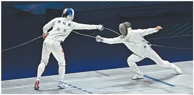運(yùn)動員在十五運(yùn)會擊劍項(xiàng)目男子重劍個(gè)人決賽中。本報(bào)記者 王 亮攝