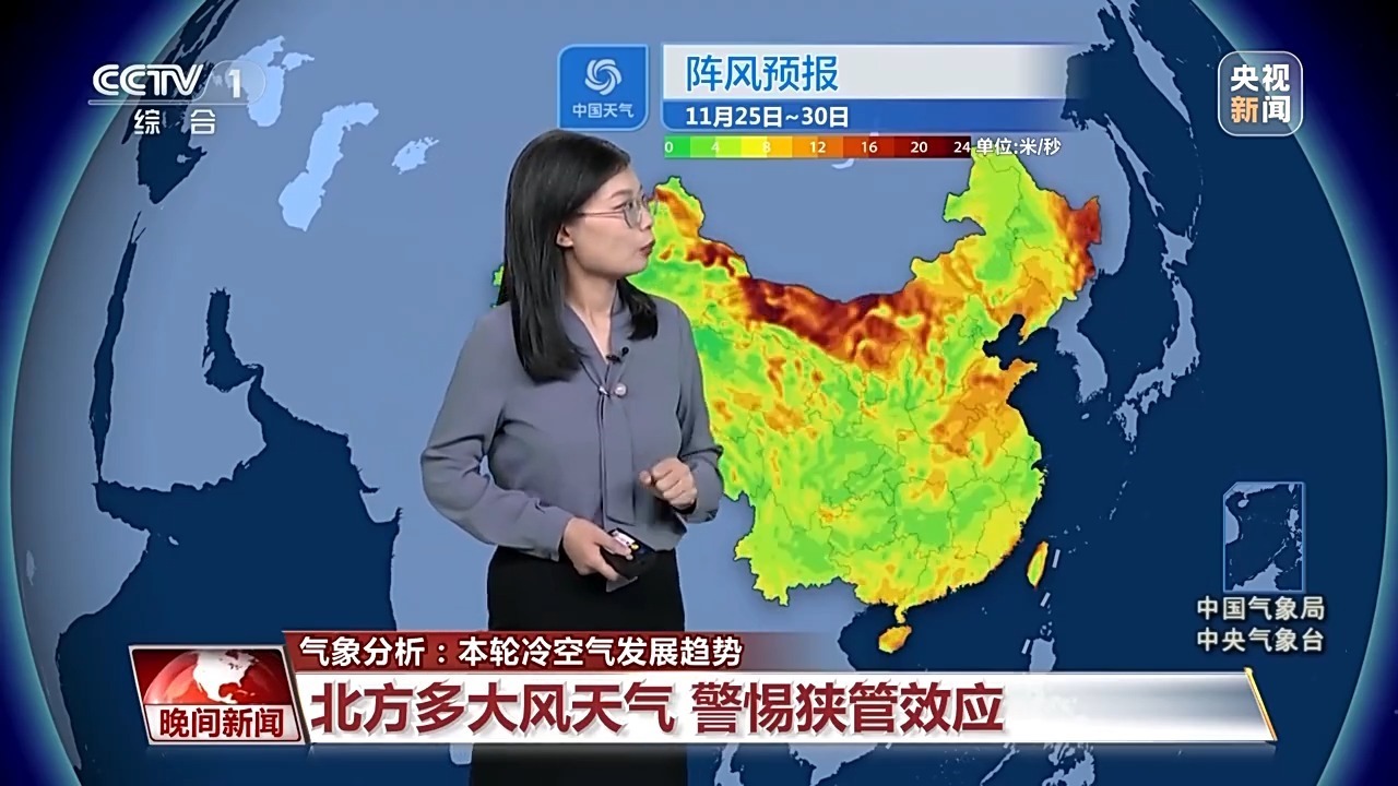 氣象分析師 孫倩倩:本周冷空氣頻繁,會導致各地氣溫多波動起伏,同時天氣干燥多風。眼下這輪冷空氣24日重點影響的是北方,尤其是在偏北的地區(qū)降溫是比較猛烈的。同時從內(nèi)蒙古中部到河南山東一帶還伴隨著6級以上的大風,局部地區(qū)陣風達到了10~11級。