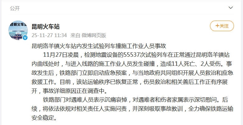 據(jù)昆明鐵路局昆明站官方微博消息,11月27日凌晨,檢測地震設(shè)備的55537次試驗列車在正常通過昆明洛羊鎮(zhèn)站內(nèi)曲線處時,與進入線路的施工作業(yè)人員發(fā)生碰撞,造成11人死亡、2人受傷。事故發(fā)生后,鐵路部門立即啟動應(yīng)急預案,與當?shù)卣餐M織開展人員救治和應(yīng)急救援工作。目前,該站運輸秩序已恢復正常,傷員救治和相關(guān)善后工作正有序展開,事故詳細原因正在調(diào)查中。