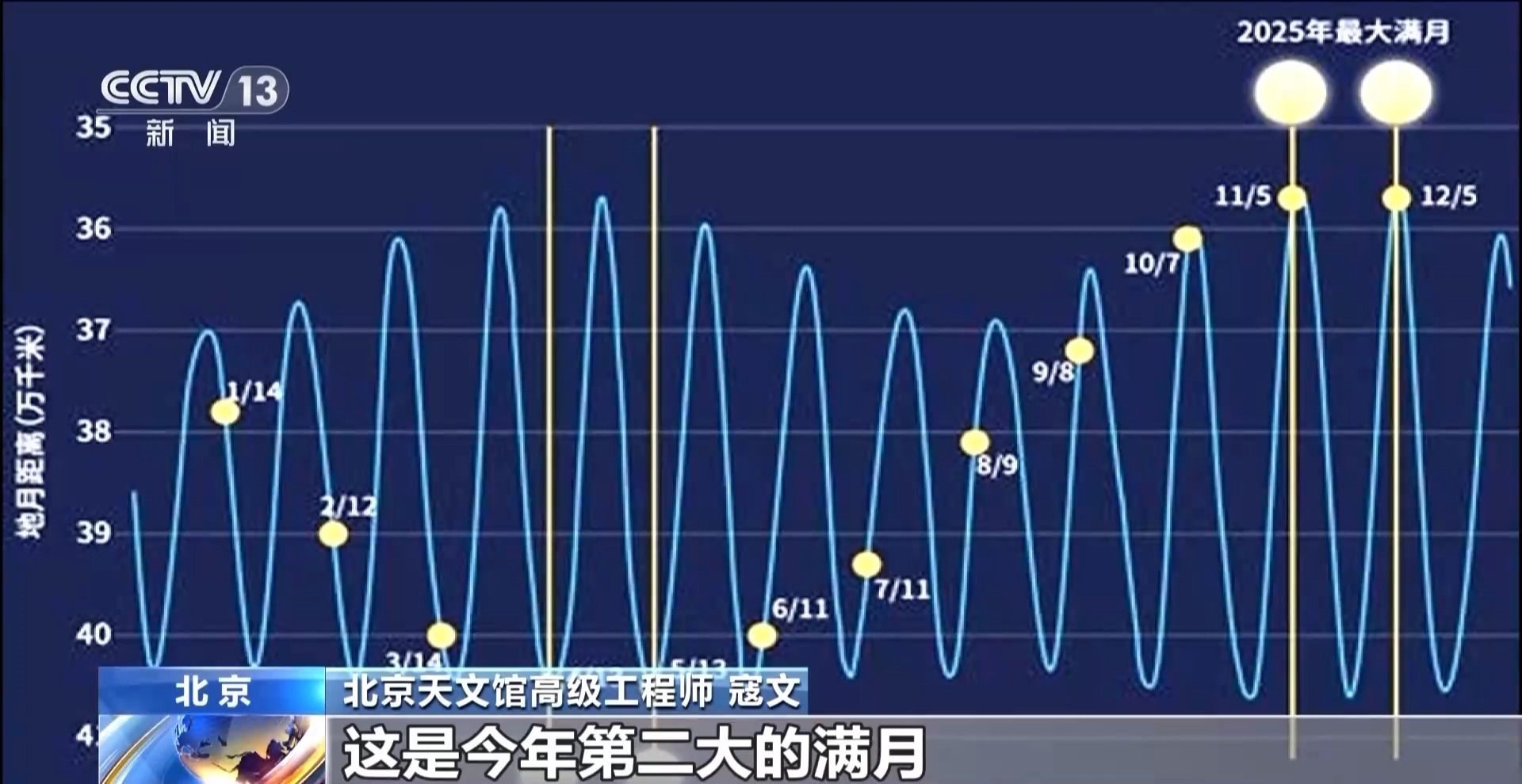北京天文館高級工程師 寇文:12月5日大約早晨7點14分是滿月,而月亮過近地點的時間是在這之前大約12個小時,這是今年第二大的滿月,也可以算是一次“超級月亮”。