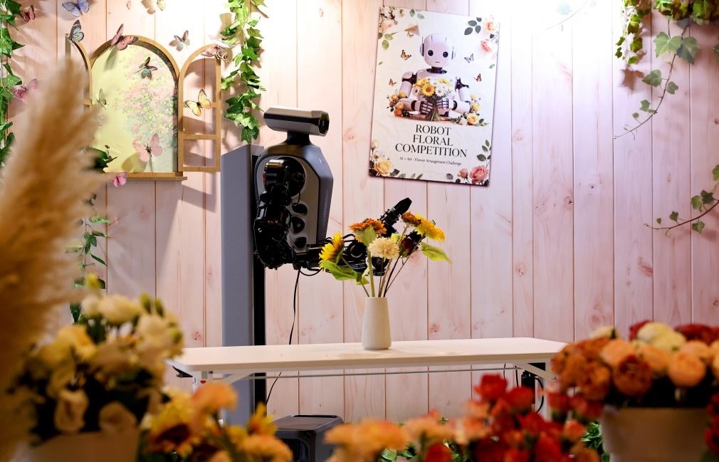 在2025全球開發(fā)者先鋒大會(huì)暨國際具身智能技能大賽上,機(jī)器人在插花競技場(chǎng)內(nèi)移動(dòng)。新華社記者方喆攝
