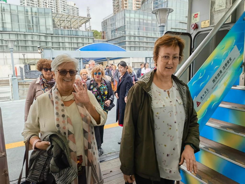 11月5日,來(lái)自西班牙等國(guó)的游客登上黃浦江游船。新華社記者 陳愛平 攝
