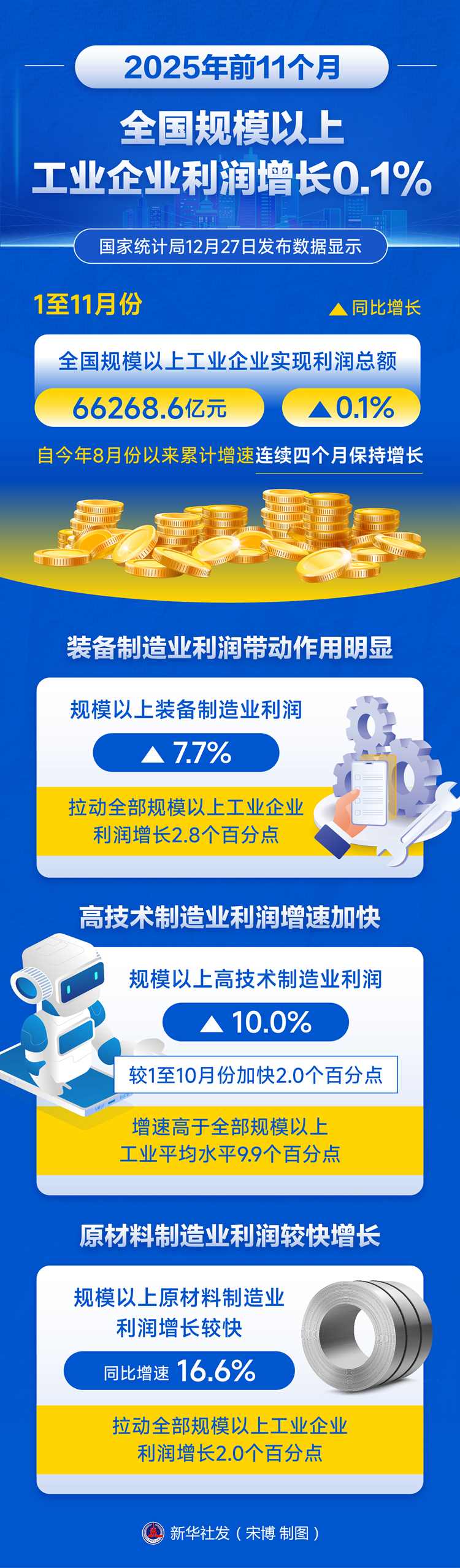 新華社北京12月27日電(記者王雨蕭)國(guó)家統(tǒng)計(jì)局27日發(fā)布數(shù)據(jù)顯示,1至11月份,全國(guó)規(guī)模以上工業(yè)企業(yè)實(shí)現(xiàn)利潤(rùn)總額66268.6億元,同比增長(zhǎng)0.1%,自今年8月份以來累計(jì)增速連續(xù)四個(gè)月保持增長(zhǎng)。