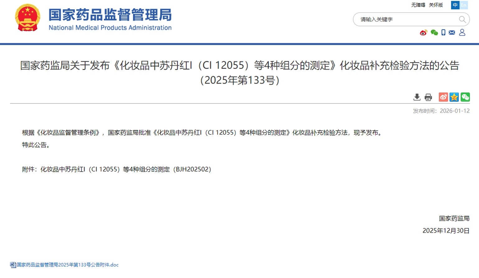 中新網(wǎng)北京1月13日電(記者 左雨晴) 國(guó)家藥監(jiān)局近日批準(zhǔn)《化妝品中蘇丹紅I(CI 12055)等4種組分的測(cè)定》化妝品補(bǔ)充檢驗(yàn)方法,該方法適用于液體(水、油)類、膏霜乳類、粉劑類、塊狀類、蠟基類化妝品中蘇丹紅Ⅰ、蘇丹紅Ⅱ、蘇丹紅Ⅲ、蘇丹紅Ⅳ的含量測(cè)定。