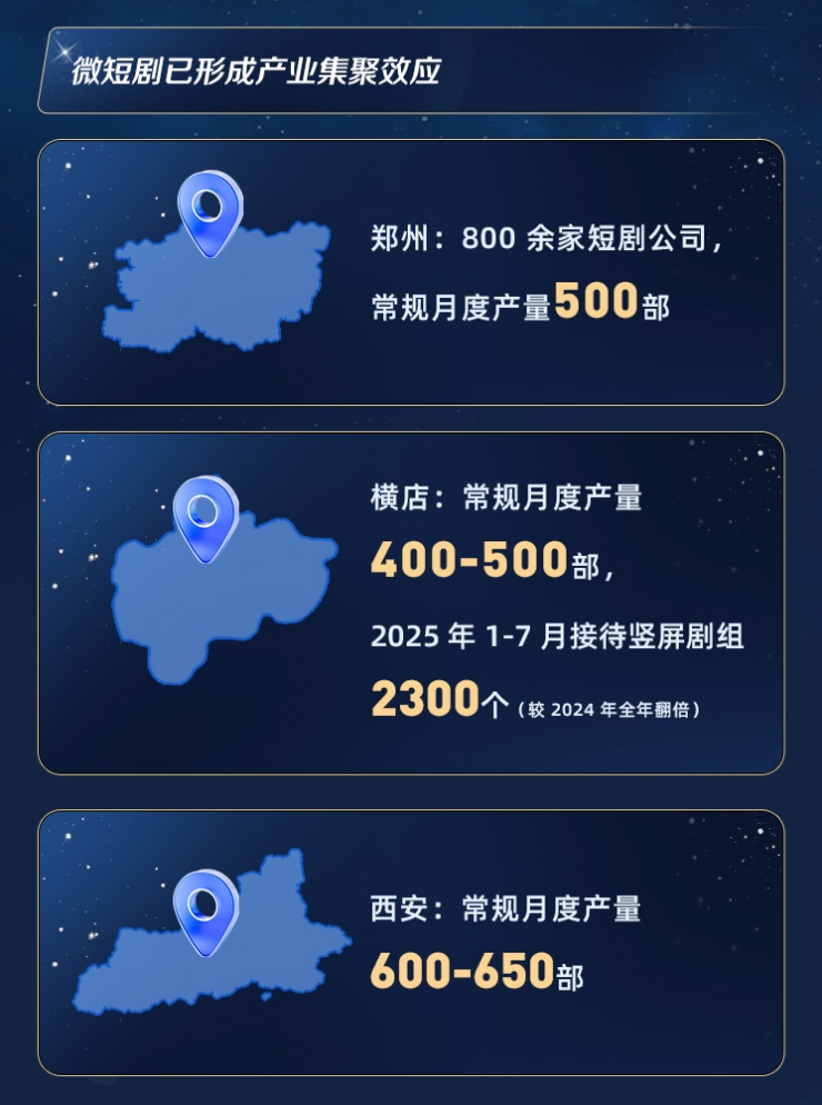 數據顯示,全國短劇月度產量已穩(wěn)定在約3000部,并在區(qū)域分工趨勢下,帶動就業(yè)從一線城市向中西部擴散。鄭州、西安、橫店等地,正成為這一產業(yè)地理格局的重要支點。