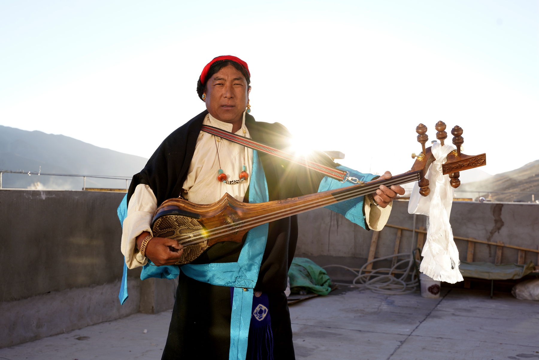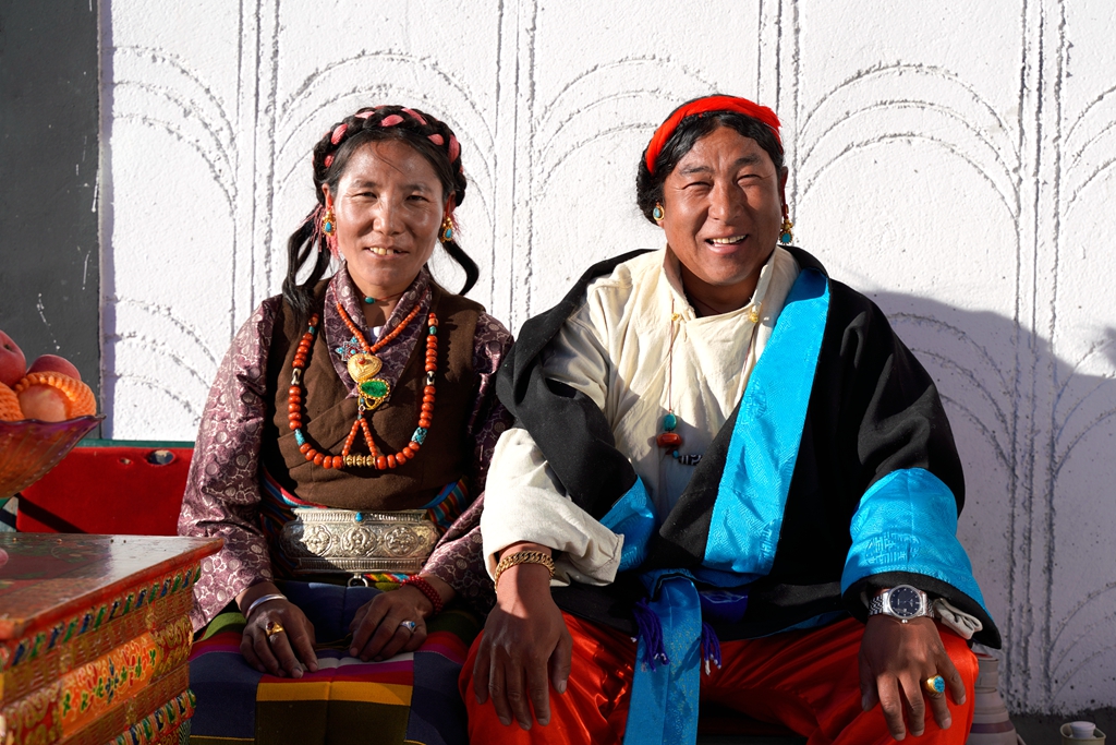 拍攝日,陽光清澈,天空湛藍。村民們穿上了最隆重的藏裝,女人發(fā)間的珊瑚與綠松石流淌著溫潤的光澤。許多老人被子女小心攙扶而來,他們的眼神里有局促,有陌生,也有隱約的期待。