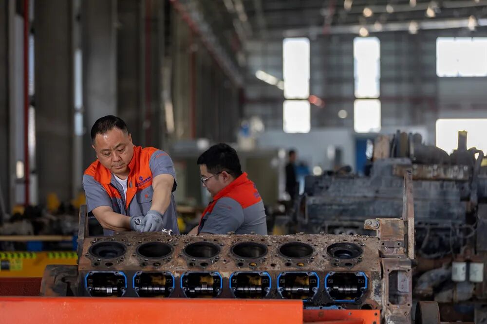 1月13日,中車國際車輛產(chǎn)業(yè)(海南)有限公司維修師在工廠維修發(fā)動機。(中國外文局歐亞中心記者段崴 攝)