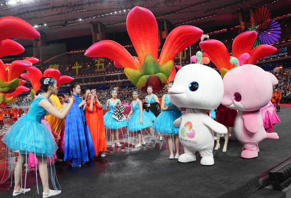 2025年11月9日,演員在第十五屆全國(guó)運(yùn)動(dòng)會(huì)開(kāi)幕式后與吉祥物“喜洋洋”和“樂(lè)融融”互動(dòng)。新華社記者 吳魯 攝