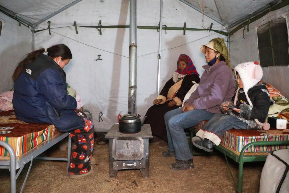 1月26日晚,在甘南州迭部縣電尕鎮(zhèn)哇曲村臨時(shí)安置點(diǎn),群眾在應(yīng)急帳篷內(nèi)取暖休息。 (新華社記者張智敏 攝)
