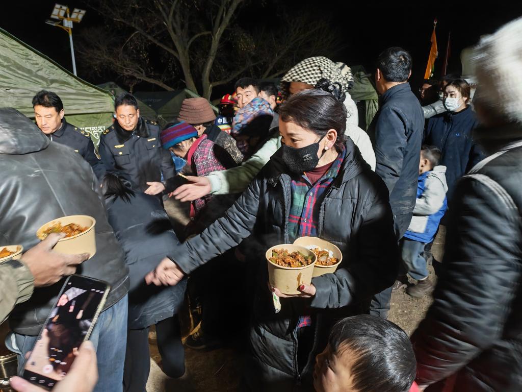 1月26日晚,在甘南州迭部縣電尕鎮(zhèn)哇曲村臨時(shí)安置點(diǎn),群眾正在領(lǐng)取愛心餐食。(新華社記者崔翰超 攝)