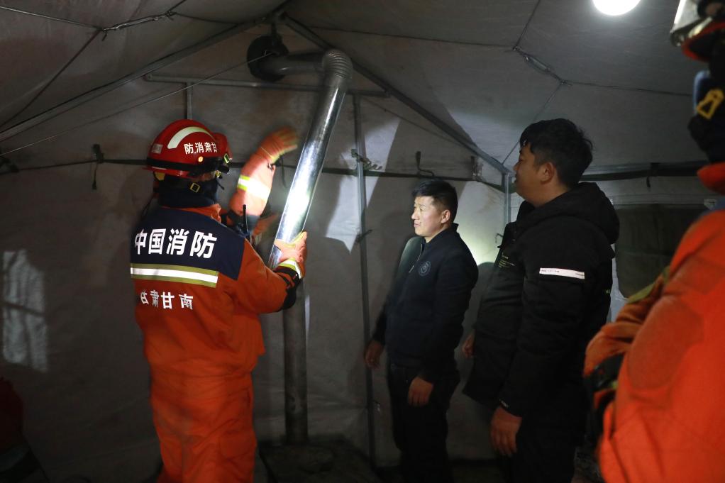 1月26日晚,在甘南州迭部縣電尕鎮(zhèn)哇曲村臨時(shí)安置點(diǎn),消防救援人員在應(yīng)急帳篷內(nèi)幫助群眾安裝煤爐煙筒。 (新華社記者張智敏 攝)