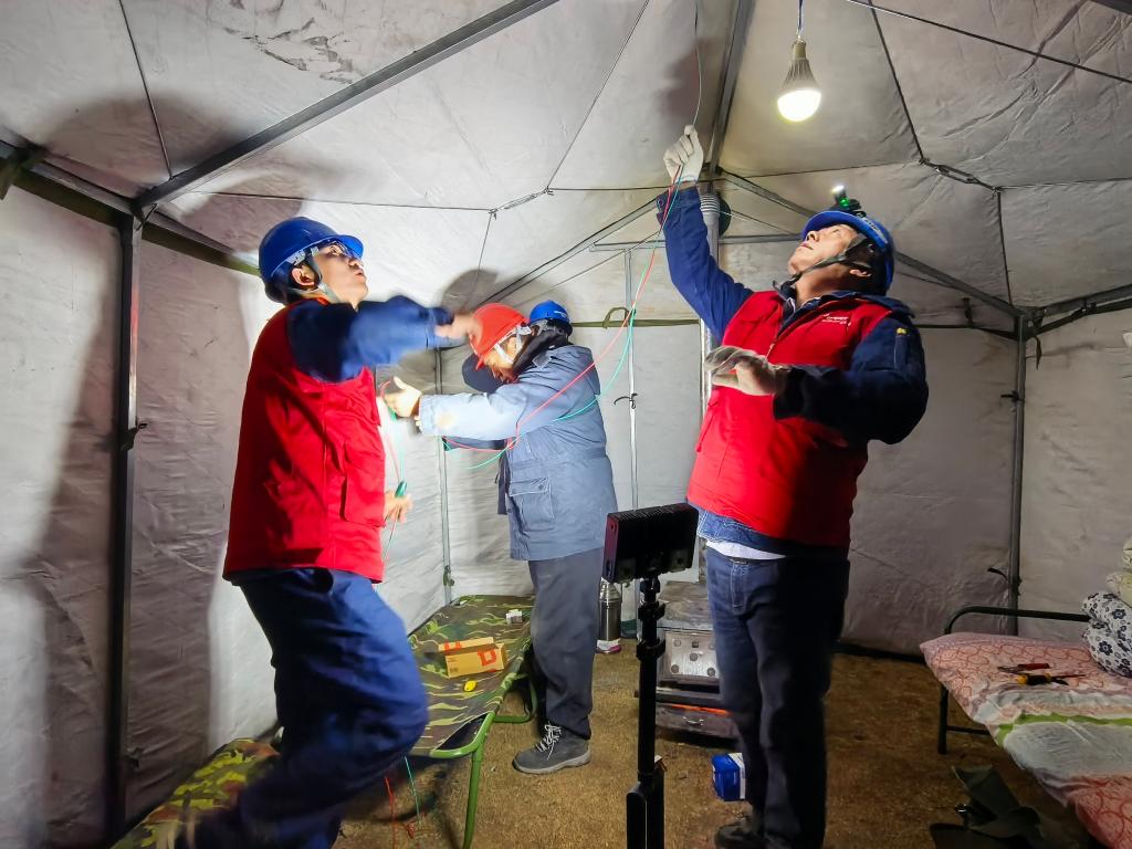 1月26日晚,國網(wǎng)甘南供電公司工作人員為臨時(shí)安置點(diǎn)應(yīng)急帳篷接電。(國網(wǎng)甘南供電公司供圖)